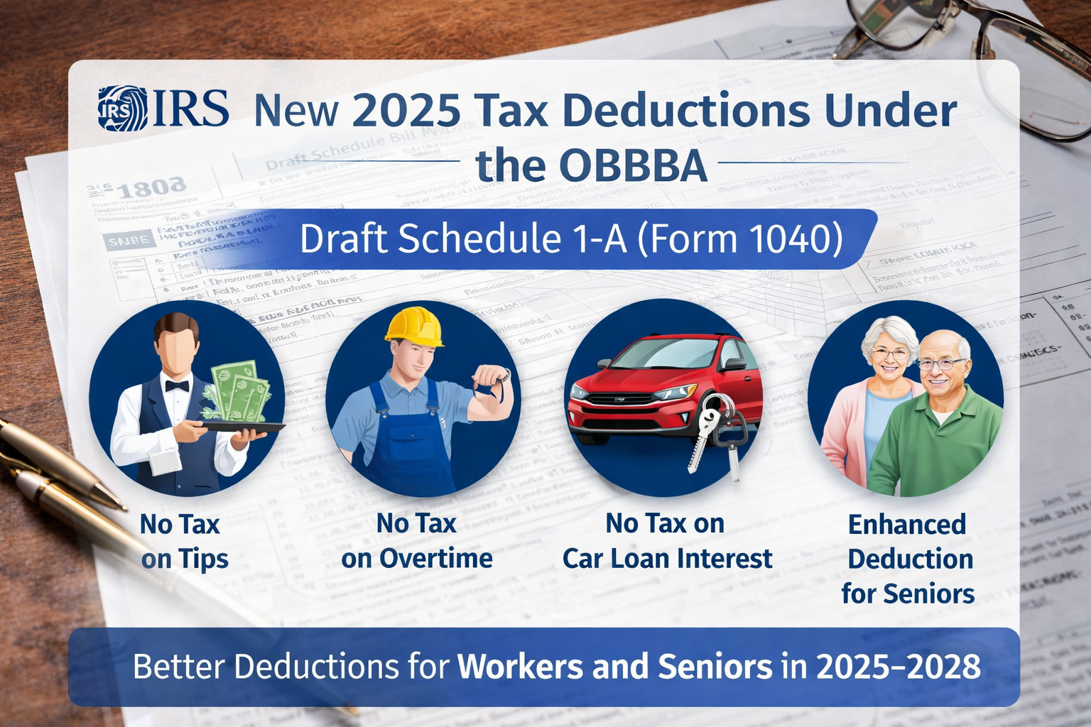 The IRS has released a draft of Schedule 1-A (Form 1040), introducing a new reporting structure for several deductions created under the One Big Beautiful Bill Act (OBBBA). These new tax deductions — available from 2025 through 2028 — are designed to provide targeted relief for workers and seniors.